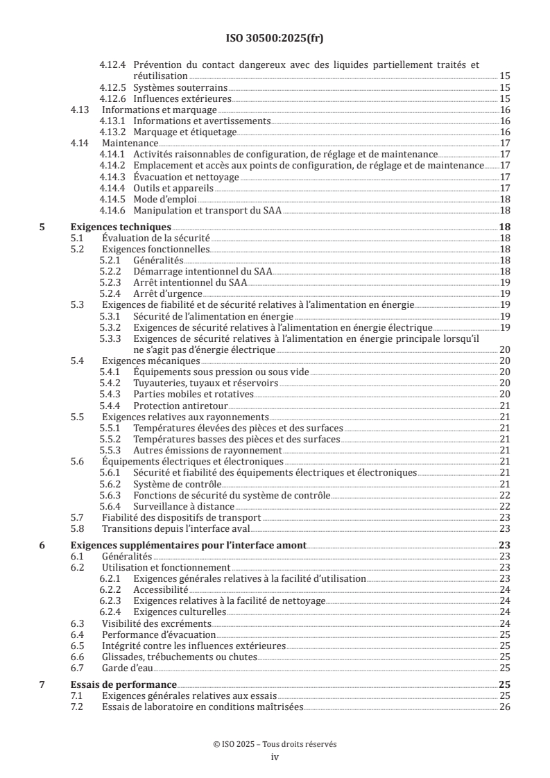 La norme ISO 30500:2025 traite des systèmes d'assainissement non raccordés au réseau, spécifiquement des unités de traitement intégrées préfabriquées. Son objectif principal est de fixer des exigences générales de sécurité et de performance pour la conception et les tests de ces systèmes, en tenant également compte de considérations de durabilité limitées. L'étendue de cette norme couvre les systèmes d'assainissement non raccordés (NSSS) qui peuvent être fabriqués en tant qu'ensemble ou en tant qu'ensemble de composants préfabriqués, destinés à être assemblés sur un site sans nécessiter de fabrication ou de modification ultérieure. Une NSSS, selon cette norme, est définie comme une unité de traitement intégrée préfabriquée comprenant des composants avant (installations sanitaires) et arrière (installations de traitement). Parmi les points forts de la norme ISO 30500:2025, on trouve sa capacité à traiter de manière sécurisée les excréments humains et à permettre la réutilisation ou l'élimination sûre des déchets solides et liquides générés. Elle établit également des critères pour la fonctionnalité, la fiabilité et la maintenabilité des systèmes, en s'assurant qu'ils répondent aux objectifs de protection de l'environnement. La norme souligne également la compatibilité des systèmes NSSS avec des préoccupations plus larges concernant la consommation d'eau et d'énergie, le recyclage des nutriments et les évaluations du cycle de vie. Bien qu’elle ne traite pas spécifiquement de l’approvisionnement en eau ou en électricité, elle reste pertinente pour les systèmes qui utilisent ces ressources, tout en se concentrant particulièrement sur ceux qui fonctionnent de manière autonome. En somme, la norme ISO 30500:2025 est un document essentiel qui fournit un cadre robuste pour la conception et l'évaluation des systèmes d'assainissement non raccordés, intégrant à la fois des considérations de sécurité et de durabilité. Sa pertinence réside dans sa capacité à répondre aux besoins contemporains en matière d'assainissement dans des contextes variés, tout en garantissant des standards d’efficacité et de sécurité.