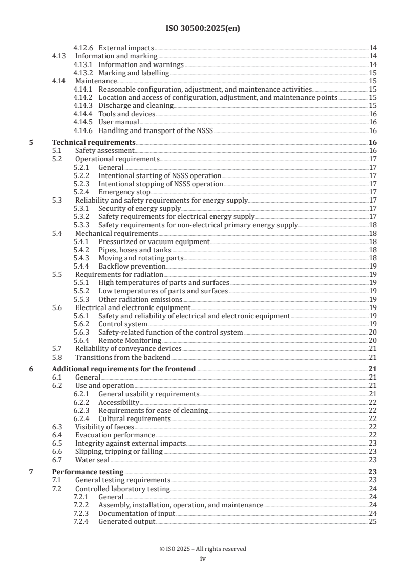 ISO 30500:2025 establishes general safety and performance requirements for prefabricated integrated non‑sewered sanitation systems (NSSS). It applies to units manufactured as a single package or as prefabricated components assembled on site without further fabrication that would change function. The standard covers the full prefabricated system - frontend (toilet facility) and backend (treatment facility) - designed to collect, convey and fully treat primarily human excreta to enable safe reuse or disposal of solid and liquid outputs while controlling air, odour and noise emissions. ISO 30500:2025 is primarily aimed at off‑grid systems (without networked sewer, water or electricity) but can also be applied to units that use supplied water and/or electricity.