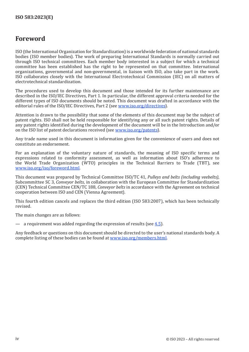 ISO 583:2023 is a standard published by the International Organization for Standardization (ISO). Its full title is "Conveyor belts with a textile carcass - Total belt thickness and thickness of constitutive elements - Test methods". This standard covers: This document specifies test methods for the determination of total belt thickness and the thickness of constitutive elements of conveyor belts having a textile carcass. The constitutive elements include the covers, the carcass and interlayers, i.e. the material between adjoining plies. This document does not apply to light conveyor belts as described in ISO 21183‑1.
