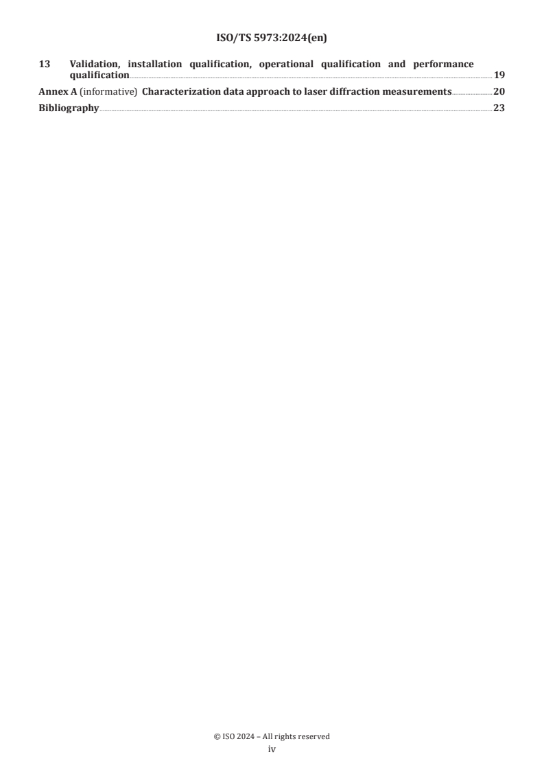 - ISO 13320 (principles and instrument evaluation for laser diffraction) - ISO/TS 5973:2024 is intended to be used in conjunction with ISO 13320 for a complete approach to laser diffraction measurement practice.