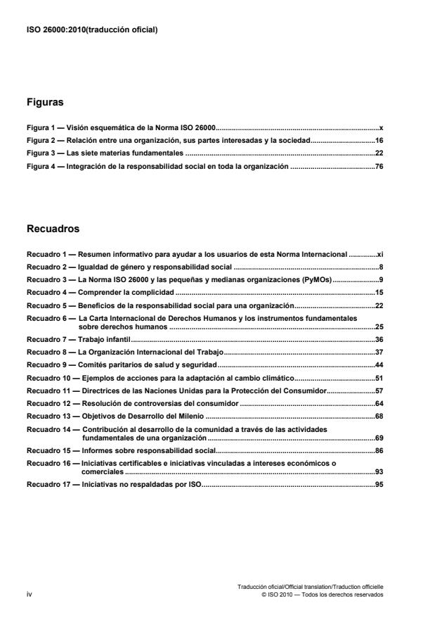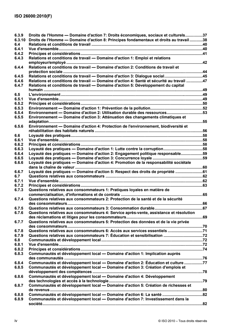 L'ISO 26000:2010 présente des lignes directrices pour tous types d'organisations, quelle que soit leur taille ou leur localisation, concernant: les concepts, termes et définitions relatifs à la responsabilité sociétale; les origines, les orientations et les caractéristiques de la responsabilité sociétale; les principes et pratiques en matière de responsabilité sociétale; les questions centrales et les domaines d'action de la responsabilité sociétale; l'intégration, la concrétisation et la promotion d'un comportement responsable dans l'ensemble de l'organisation, et à travers ses politiques et pratiques, dans sa sphère d'influence; l'identification des parties prenantes et le dialogue avec elles; et la communication sur les engagements, les performances et autres informations concernant la responsabilité sociétale. L'ISO 26000:2010 a vocation à aider les organisations à contribuer au développement durable. Elle vise à encourager les organisations à aller au-delà du respect de la loi, tout en reconnaissant que le respect de la loi est un devoir fondamental pour toute organisation et une partie essentielle de sa responsabilité sociétale. Elle a vocation à promouvoir une compréhension commune dans le domaine de la responsabilité sociétale et à compléter les autres instruments et initiatives de responsabilité sociétale, non à les remplacer. Lors de l'application de l'ISO 26000:2010, il est recommandé que l'organisation prenne en considération les différences sociétales, environnementales, juridiques, culturelles, politiques et la diversité des organisations ainsi que les différences de conditions économiques, en toute cohérence avec les normes internationales de comportement.