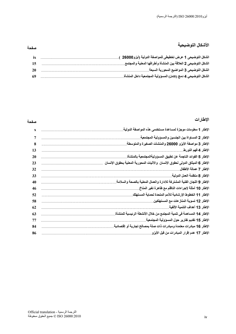ISO 26000:2010 provides guidance to all types of organizations, regardless of their size or location, on: concepts, terms and definitions related to social responsibility; the background, trends and characteristics of social responsibility; principles and practices relating to social responsibility; the core subjects and issues of social responsibility; integrating, implementing and promoting socially responsible behaviour throughout the organization and, through its policies and practices, within its sphere of influence; identifying and engaging with stakeholders; and communicating commitments, performance and other information related to social responsibility. ISO 26000:2010 is intended to assist organizations in contributing to sustainable development. It is intended to encourage them to go beyond legal compliance, recognizing that compliance with law is a fundamental duty of any organization and an essential part of their social responsibility. It is intended to promote common understanding in the field of social responsibility, and to complement other instruments and initiatives for social responsibility, not to replace them. In applying ISO 26000:2010, it is advisable that an organization take into consideration societal, environmental, legal, cultural, political and organizational diversity, as well as differences in economic conditions, while being consistent with international norms of behaviour. ISO 26000:2010 is not a management system standard. It is not intended or appropriate for certification purposes or regulatory or contractual use. Any offer to certify, or claims to be certified, to ISO 26000 would be a misrepresentation of the intent and purpose and a misuse of ISO 26000:2010. As ISO 26000:2010 does not contain requirements, any such certification would not be a demonstration of conformity with ISO 26000:2010. ISO 26000:2010 is intended to provide organizations with guidance concerning social responsibility and can be used as part of public policy activities. However, for the purposes of the Marrakech Agreement establishing the World Trade Organization (WTO), it is not intended to be interpreted as an “international standard”, “guideline” or “recommendation”, nor is it intended to provide a basis for any presumption or finding that a measure is consistent with WTO obligations. Further, it is not intended to provide a basis for legal actions, complaints, defences or other claims in any international, domestic or other proceeding, nor is it intended to be cited as evidence of the evolution of customary international law. ISO 26000:2010 is not intended to prevent the development of national standards that are more specific, more demanding, or of a different type.