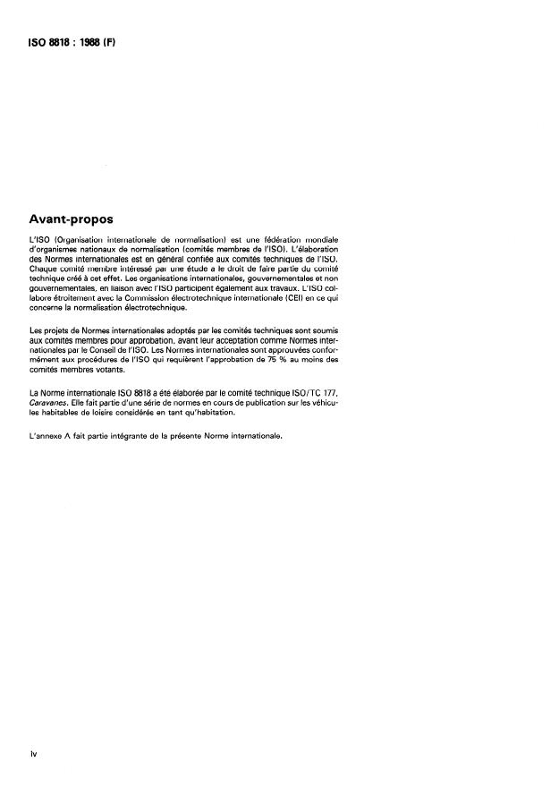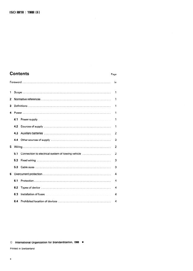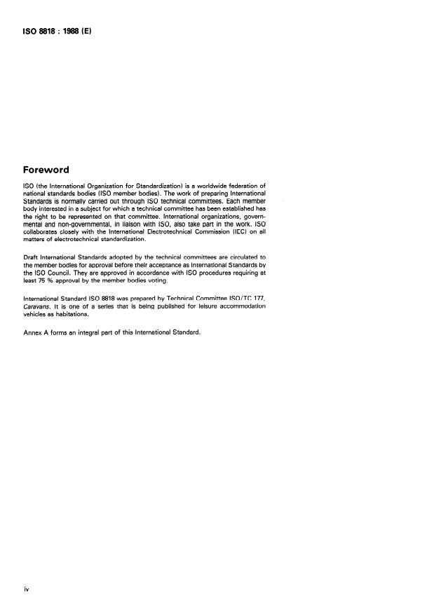ISO 8818:1988 is a standard published by the International Organization for Standardization (ISO). Its full title is "Leisure accommodation vehicles — Caravans — 12 V direct current extra low voltage electrical installations". This standard covers: Specifies safety and functional requirements for 12 V installations and includes an annex that gives means of determining the minimum cross-sectional area of cables. Does not apply the commercial trailers or motor caravans, nor does it include requirements for ELV road lighting and signalling lamps and their installations.