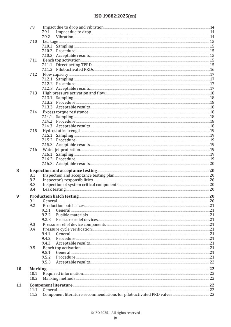 ISO 19882:2025 outlines critical requirements for thermally activated pressure relief devices used in compressed hydrogen vehicle fuel containers. The primary focus of this standard is to ensure safety and functionality in hydrogen-fuelled vehicles, adhering to a range of specifications including ISO 19881, IEC 62282-4-101, CSA/ANSI HGV 2, EC79/EU406, SAE J2579, UN ECE R134, and UN GTR No. 13. The scope is specifically tailored to thermally activated pressure relief devices for land vehicles, including light-duty and heavy-duty vehicles as well as industrial powered trucks like forklifts. One of the significant strengths of ISO 19882:2025 is its comprehensive approach to setting the minimum requirements for pressure relief devices. By standardizing the criteria for these devices, it enhances safety in the use of gaseous hydrogen in various vehicle types. This is particularly crucial given the volatile nature of hydrogen and its applications in fuel cell and internal combustion engines. The relevance of this standard cannot be overstated, especially as the automotive industry shifts towards more sustainable energy sources. The inclusion of established standards such as ISO 14687 for fuel quality further solidifies the document’s role in promoting safe practices in the hydrogen sector. The specific guideline that it does not apply to reseating, resealing, or pressure-activated devices ensures clarity in its application, focusing solely on thermally activated mechanisms which are pivotal in managing pressure effectively. Overall, ISO 19882:2025 is a vital document ensuring maximum compliance with safety protocols for thermally activated pressure relief devices, making it instrumental for manufacturers and operators in the hydrogen vehicle sector. Its detailed specifications and clear boundaries provide a robust framework for the development and implementation of safe and reliable pressure relief solutions.
