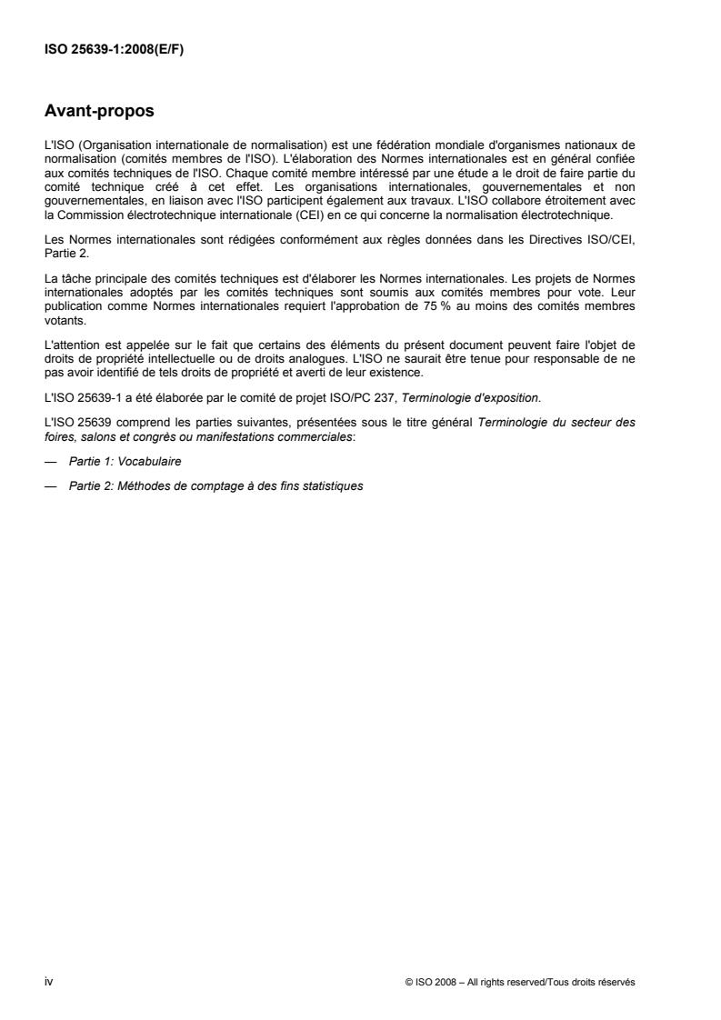 L'ISO 25639-1:2008 spécifie les termes et définitions communément utilisés dans le secteur économique des foires, salons et congrès ou manifestations commerciales. Ils sont regroupés en quatre catégories: individus et entités, qui répertorie et classe les divers types d'acteurs concernés par le secteur des foires, salons et congrès; type d'événement, qui définit les types de manifestations commerciales et l'ensemble des réunions associées; éléments matériels, qui décrivent la taille des diverses composantes d'une exposition, le type d'installation et la documentation imprimée; divers.