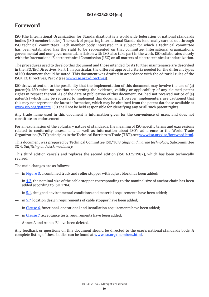 ISO 6325:2024 is a standard published by the International Organization for Standardization (ISO). Its full title is "Ships and marine technology - Cable stoppers". This standard covers: This document specifies requirements for the types, sizes, design, construction, strength, safety, function, operation, installation and acceptance tests of cable stoppers. This document is applicable to the design, manufacturing and acceptance tests of cable stoppers for use with marine windlasses and anchor capstans as defined in ISO 4568.