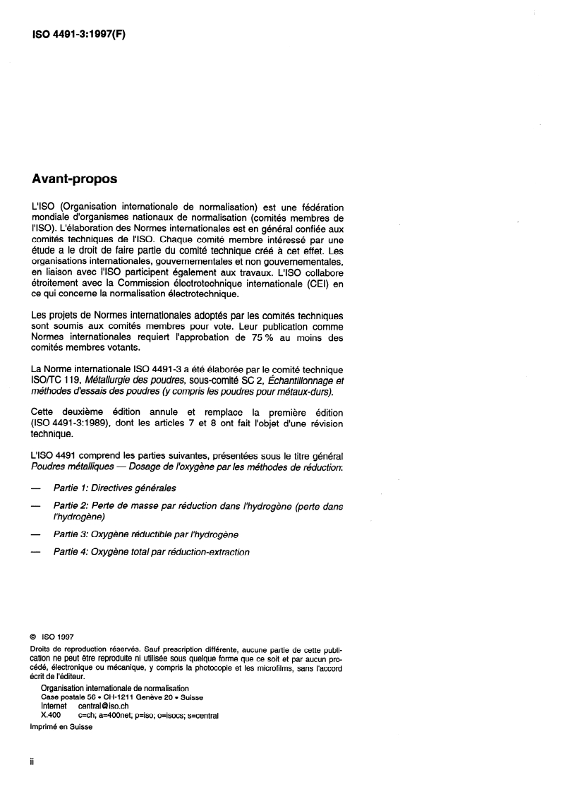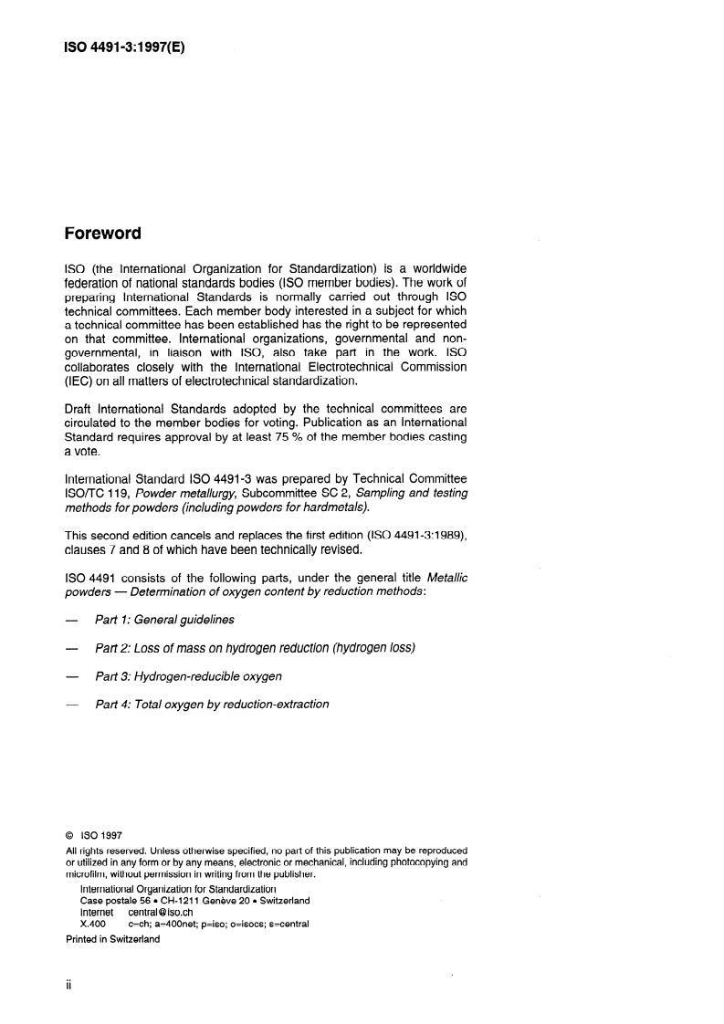 Keywords: ISO 4491-3, hydrogen-reducible oxygen, metallic powders, oxygen content determination, powder metallurgy, Karl Fischer titration, reduction methods.