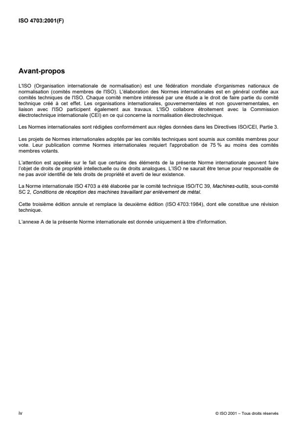 ISO 4703:2001 is a standard published by the International Organization for Standardization (ISO). Its full title is "Test conditions for surface grinding machines with two columns - Machines for grinding slideways - Testing of the accuracy". This standard covers: La présente Norme internationale spécifie, par référence à l'ISO 230-1 et à l'ISO 230-2, les essais géométriques, les essais d'usinage et les essais pour le contrôle de la précision et de la répétabilité de positionnement des machines à rectifier les surfaces planes à deux montants et à rectifier les glissières d'usage général et de précision normale. Elle spécifie également les tolérances applicables correspondant aux essais susmentionnés. La présente Norme internationale s'applique aux machines à mouvements de rectification rectiligne et équipées d'une table mobile. Elle ne s'applique pas aux machines équipées d'une table fixe ou à mouvement rotatif. La présente Norme internationale ne traite que du contrôle de la précision de la machine. Elle ne concerne ni l'examen de son fonctionnement (vibrations, bruits anormaux, points durs dans les déplacements d'organes, etc.) ni celui de ses caractéristiques (vitesses, avances, etc.), examens qui doivent en général précéder celui de la précision. La présente Norme internationale définit la terminologie utilisée pour les éléments principaux de la machine et indique la désignation des axes conformément à l'ISO 841. NOTE En complément des termes utilisés dans les trois langues officielles de l'ISO (anglais, français et russe), la présente Norme internationale donne, dans l'annexe A, les termes équivalents dans les langues allemande et italienne; ces termes sont publiés sous la responsabilité des comités membres de l'Allemagne (DIN) et de l'Italie (UNI). Toutefois, seuls les termes donnés dans les langues officielles peuvent être considérés comme étant des termes de l'ISO.