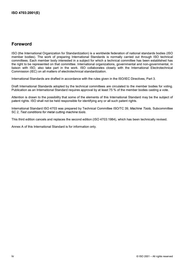 ISO 4703:2001 specifies test conditions and acceptance checks for surface grinding machines with two columns used for grinding slideways. It defines the geometric tests, machining tests (finishing cuts only) and the procedures for checking the accuracy and repeatability of positioning on general-purpose and normal-accuracy two-column surface grinders with a movable table. The standard is limited to verification of machine accuracy (not to operational characteristics such as vibration, speeds or feeds) and excludes machines with fixed or rotary tables.