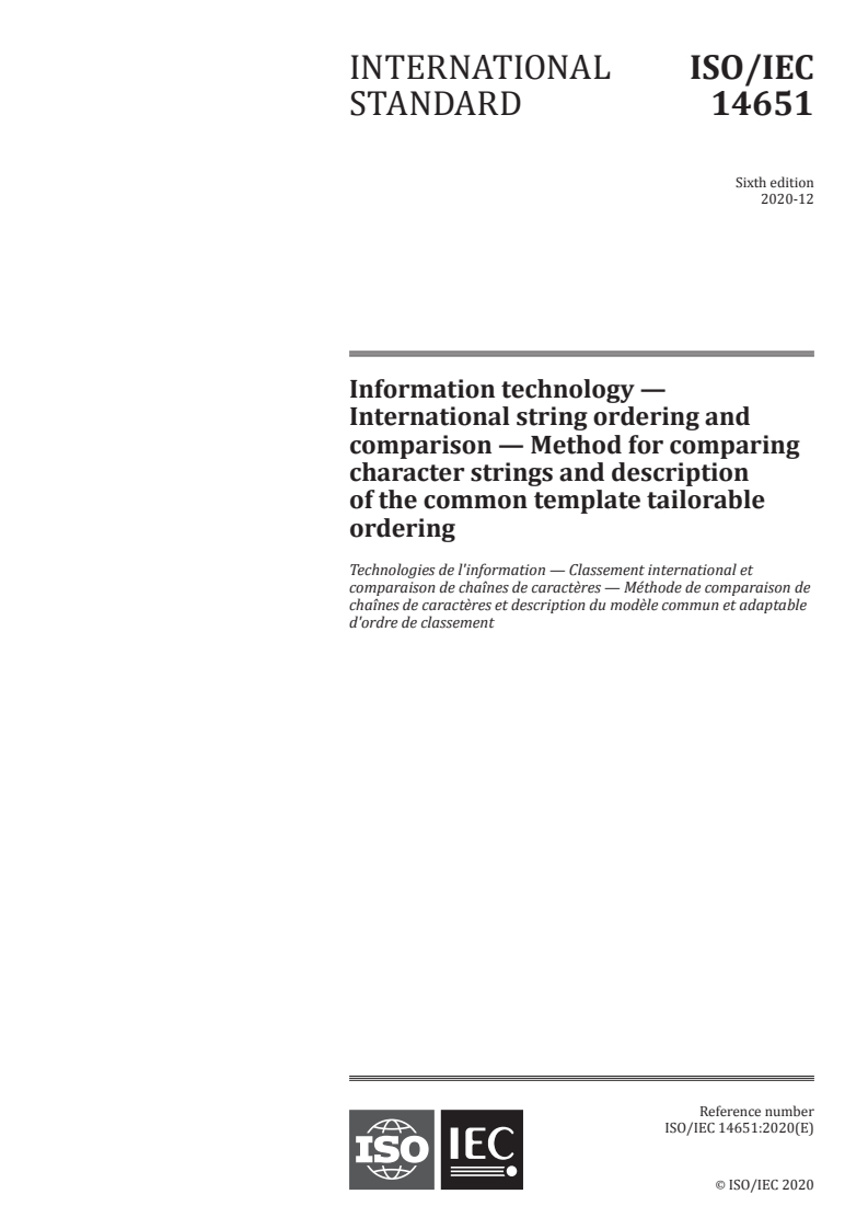 ISO/IEC 14651:2020 is a standard published by the International Organization for Standardization (ISO). Its full title is "Information technology - International string ordering and comparison - Method for comparing character strings and description of the common template tailorable ordering". This standard covers: This document defines the following. - A reference comparison method. This method is applicable to two character strings to determine their collating order in a sorted list. The method can be applied to strings containing characters from the full repertoire of ISO/IEC 10646. This method is also applicable to subsets of that repertoire, such as those of the different ISO/IEC 8-bit standard character sets, or any other character set, standardized or not, to produce ordering results valid (after tailoring) for a given set of languages for each script. This method uses collation tables derived either from the Common Template Table defined in this document or from one of its tailorings. This method provides a reference format. The format is described using the Backus-Naur Form (BNF). This format is used to describe the Common Template Table. The format is used normatively within this document. - A Common Template Table. A given tailoring of the Common Template Table is used by the reference comparison method. The Common Template Table describes an order for all characters encoded in the Unicode 13.0 standard,[27] included in ISO/IEC 10646:2020. It allows for a specification of a fully deterministic ordering. This table enables the specification of a string ordering adapted to local ordering rules, without requiring an implementer to have knowledge of all the different scripts already encoded in the Universal Coded Character Set (UCS). NOTE 1 This Common Template Table is to be modified to suit the needs of a local environment. The main worldwide benefit is that, for other scripts, often no modification is required and the order will remain as consistent as possible and predictable from an international point of view. NOTE 2 The character repertoire used in this document is equivalent to that of the Unicode Standard version 13.0[27]. - A reference name. The reference name refers to this particular version of the Common Template Table, for use as a reference when tailoring. In particular, this name implies that the table is linked to a particular stage of development of the ISO/IEC 10646 Universal coded character set. - Requirements for a declaration of the differences (delta) between the collation table and the Common Template Table. This document does not mandate the following. - A specific comparison method; any equivalent method giving the same results is acceptable. - A specific format for describing or tailoring tables in a given implementation. - Specific symbols to be used by implementations, except for the name of the Common Template Table. - Any specific user interface for choosing options. - Any specific internal format for intermediate keys used when comparing, nor for the table used. The use of numeric keys is not mandated either. - A context-dependent ordering. - Any particular preparation of character strings prior to comparison. NOTE 1 It is normally necessary to do preparation of character strings prior to comparison even if it is not prescribed by this document (see Annex C). NOTE 2 Annex D describes problems that gave way to this International Standard with their anticipated solutions.