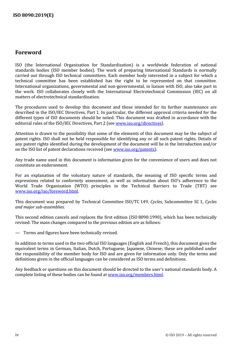 - Maintenance and provenance: Prepared by ISO/TC 149 (Cycles), SC1; this edition cancels and technically revises ISO 8090:1990.