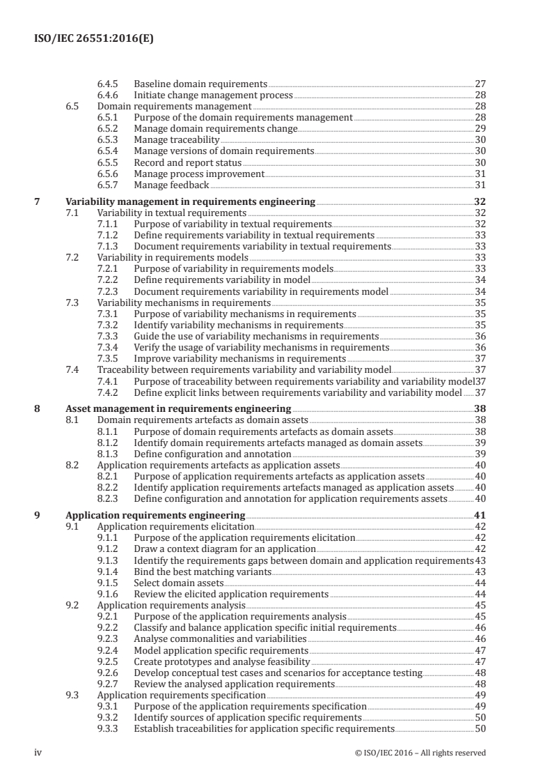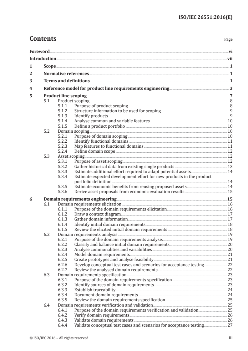 ISO/IEC 26551:2016 is a standard published by the International Organization for Standardization (ISO). Its full title is "Software and systems engineering - Tools and methods for product line requirements engineering". This standard covers: ISO/IEC 26551:2016, within the context of tools and methods of requirements engineering for software and systems product lines: - provides the terms and definitions specific to requirements engineering for software and systems product lines and associated member products; - defines process groups and their processes performed during product line requirements engineering (those processes are described in terms of purpose, inputs, tasks, and outcomes); - defines method capabilities to support the defined tasks of each process; - defines tool capabilities to automate/semi-automate tasks or defined method capabilities. ISO/IEC 26551:2016 concerns processes and capabilities of requirements tools and methods for a family of products, not for a single system. This International Standard is not applicable to physical artefacts. Instead, system-level artefacts and software lifecycle artefacts such as requirements documents, architectural data, validation plans, behavioural models, etc. are produced using methods and tools in this International Standard. In the case of the software components of a system, this International Standard can apply twice: once to handle the system elements of the product line and a second time to handle the software elements of the product line, if any. The product line processes are recursive within the different levels of products. NOTE The requirements in this International Standard apply to the family of systems, software or services.