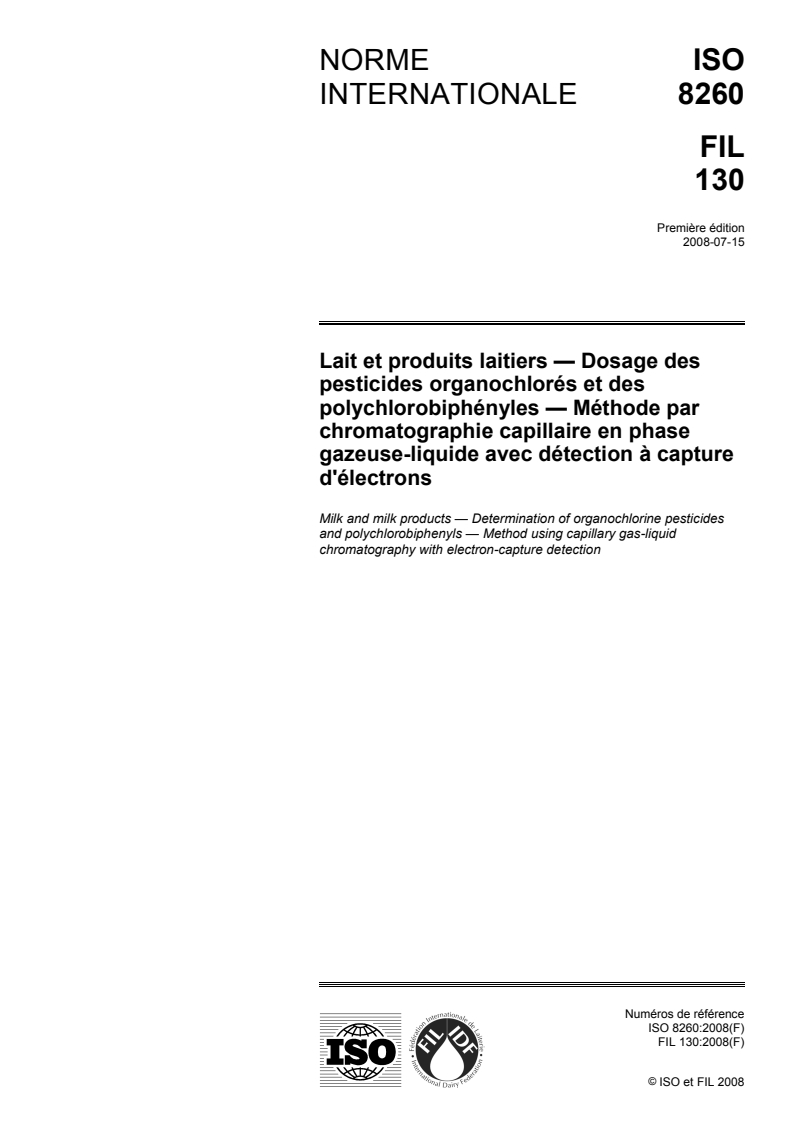 L'ISO 8260|FIL 130:2008 spécifie une méthode de détermination des teneurs en pesticides organochlorés (POC) et en polychlorobiphényles (PCB) dans le lait, le lait concentré non sucré, le lait concentré sucré, les produits laitiers en poudre, le beurre et la matière grasse butyrique, le fromage et les autres produits laitiers. La méthode est applicable au dosage des faibles niveaux de POC spécifiques, jusqu'à 5 µg de POC par kilogramme de matière grasse, et au dosage des faibles niveaux de PCB spécifiques, jusqu'à 2,5 µg de PCB par kilogramme de matière grasse, par chromatographie en phase gazeuse sur colonne capillaire avec détecteur à capture d'électrons (CPG-DCE).