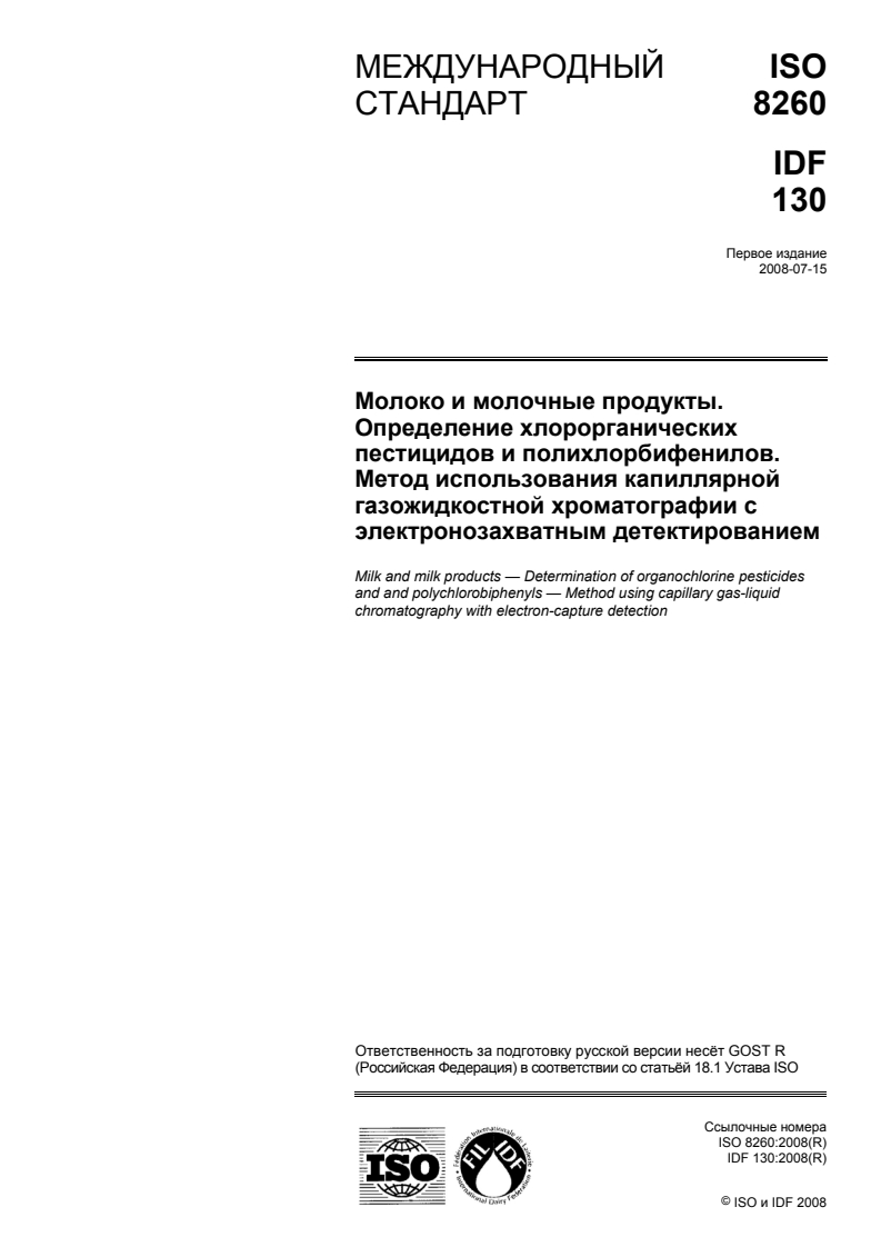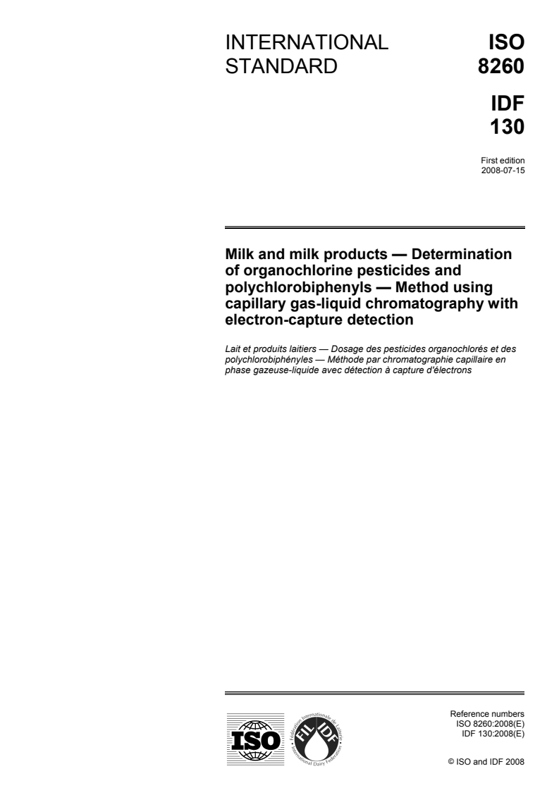 ISO 8260:2008 - Milk and milk products — Determination of organochlorine pesticides and polychlorobiphenyls — Method using capillary gas-liquid chromatography with electron-capture detection Released:4/26/2010