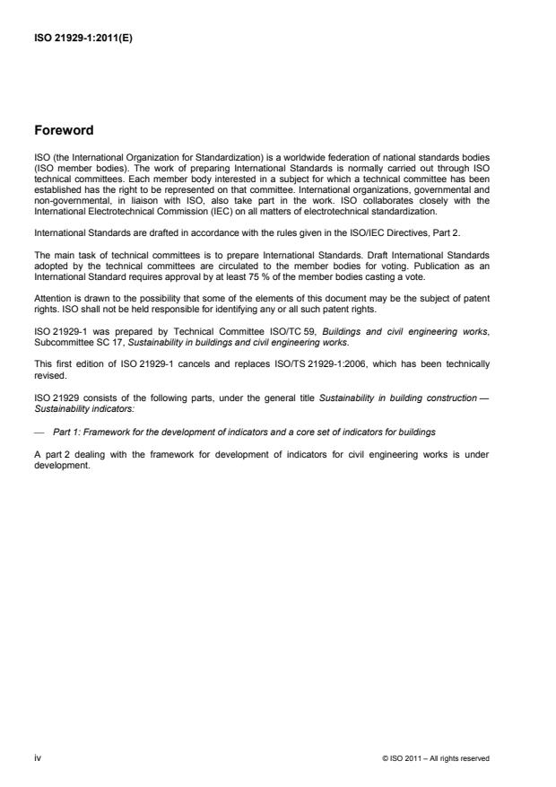 ISO 21929-1:2011 is a standard published by the International Organization for Standardization (ISO). Its full title is "Sustainability in building construction - Sustainability indicators - Part 1: Framework for the development of indicators and a core set of indicators for buildings". This standard covers: ISO 21929-1:2011 establishes a core set of indicators to take into account in the use and development of sustainability indicators for assessing the sustainability performance of new or existing buildings, related to their design, construction, operation, maintenance, refurbishment and end of life. Together, the core set of indicators provides measures to express the contribution of a building(s) to sustainability and sustainable development. These indicators represent aspects of buildings that impact on areas of protection related to sustainability and sustainable development. The object of consideration in ISO 21929-1:2011 is a building or a group of buildings and the external works within the site (curtilage). ISO 21929-1:2011 follows the principles set out in ISO 15392 and, where appropriate, is intended for use in conjunction with, and following the principles set out in, ISO 26000, ISO 14040 and the family of International Standards that includes ISO 14020, ISO 14021, ISO 14024 and ISO 14025. Where deviation occurs or where more specific requirements are stated, ISO 21929-1:2011 takes precedence. ISO 21929-1:2011 adapts general sustainability principles for buildings; includes a framework for developing sustainability indicators for use in the assessment of economic, environmental and social impacts of buildings; determines the aspects for consideration when defining a core set of sustainability indicators for buildings; establishes a core set of indicators; describes how to use sustainability indicators; and gives rules for establishing a system of indicators. ISO 21929-1:2011 does not give guidelines for the weighting of indicators or the aggregation of assessment results.