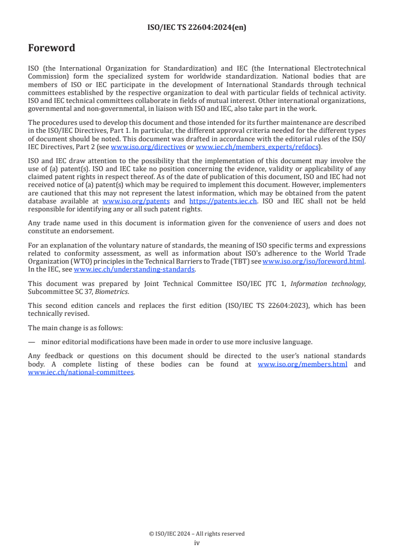 ISO/IEC TS 22604:2024 is a technical specification published by the International Organization for Standardization (ISO). Its full title is "Information technology - Biometric recognition of subjects in motion in access-related systems". This standard covers: This document establishes requirements for the development of biometric solutions for verification and identification processes for secure access without physical contact with any device at any time. The solutions acquire biometric characteristics that are captured while the data subjects are in motion to verify or identify the individuals requiring access, thus controlling access using contactless biometrics.