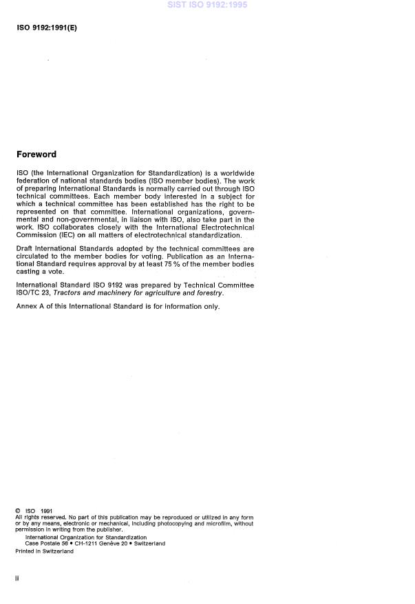ISO 9192:1991 specifies the requirements for a one‑point tubular sleeve hitch used to attach implements and accessories to the rear of lawn and garden ride‑on (riding) tractors. The standard defines dimensional interfaces and performance requirements so implements fitted with a tubular yoke and the tractor hitch will mate reliably when used with a manual or power lift system. ISO 9192 helps ensure interchangeability, safety and predictable behavior across tractor and implement designs.