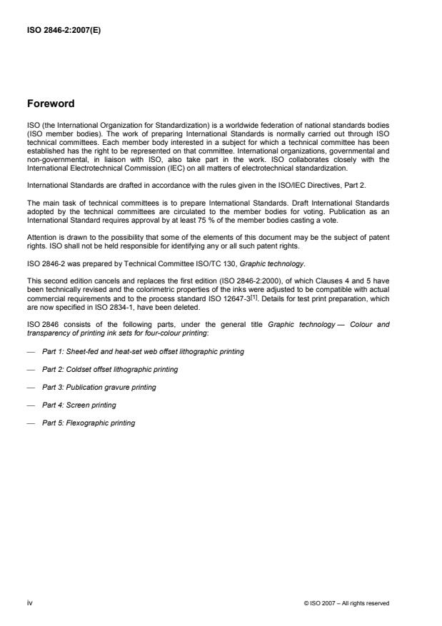 ISO 2846-2:2007 specifies the colour and transparency to be produced by inks intended for four-colour coldset web offset printing when printed under specified conditions on a printability tester. It also describes the test method to ensure conformance. ISO 2846-2:2007 is not applicable to fluorescent inks and does not specify pigments (or spectral reflectance) so as not to preclude the use of suitable future pigment combinations and still claim compliance with its colorimetric requirements.