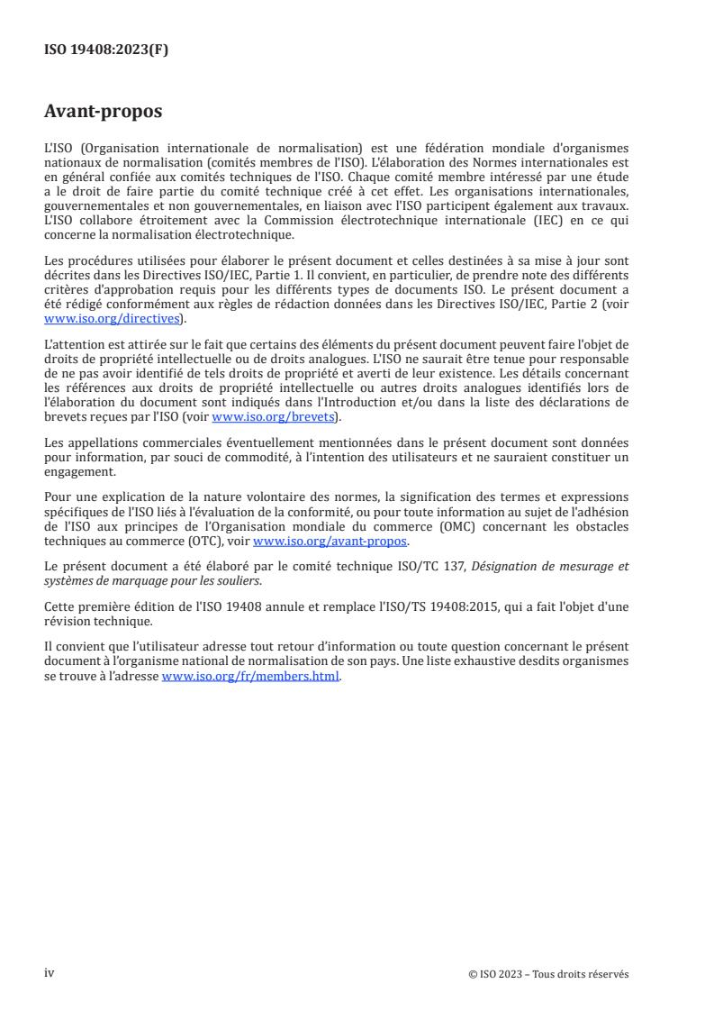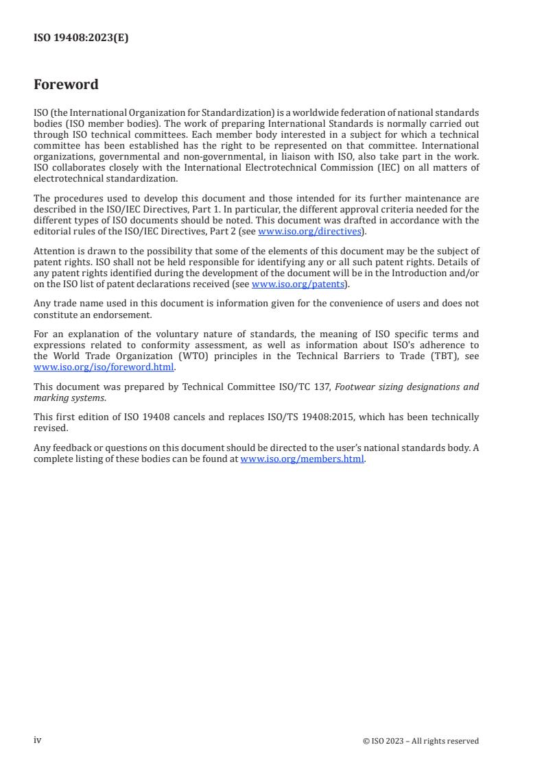ISO 19408:2023 is a standard published by the International Organization for Standardization (ISO). Its full title is "Footwear - Sizing - Vocabulary". This standard covers: ISO/TS 19408:2015 defines terms commonly used for measuring feet and lasts and for determining the size of footwear. This vocabulary complements ISO 19952, Footwear ? Vocabulary. The term "shoe" means all types of footwear.