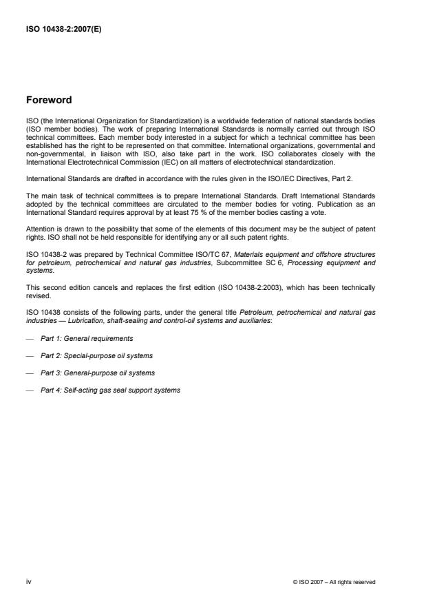 ISO 10438-2:2007 is a standard published by the International Organization for Standardization (ISO). Its full title is "Petroleum, petrochemical and natural gas industries - Lubrication, shaft-sealing and control-oil systems and auxiliaries - Part 2: Special-purpose oil systems". This standard covers: ISO 10438-2:2007, in conjunction with ISO 10438-1, specifies requirements for oil systems for special-purpose applications. These oil systems can provide lubrication oil, seal oil or both. These systems can serve equipment such as compressors, gears, pumps and drivers.