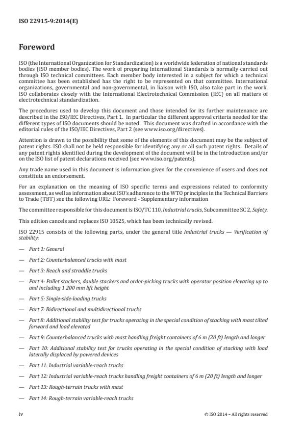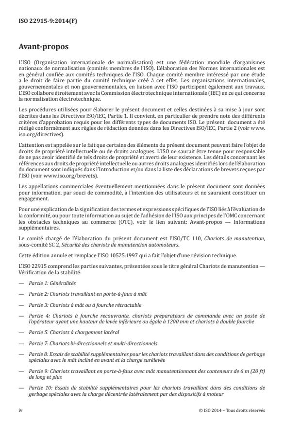 l'ISO 22915-9:2014 spécifie les essais pour vérifier la stabilité des chariots en porte-à-faux à mât lorsqu'ils manutentionnent des conteneurs de fret vides ou pleins de 6 m (20 ft) de long et plus. Elle est applicable à ces types de chariots de manutention équipés de fourche, d'un palonnier, (levage par le dessus ou par le côté), ou tout autre moyen de prise de charge applicable à la manutention des conteneurs. Elle ne s'applique pas aux chariots manutentionnant des conteneurs avec un centre de gravité mobile (voir ISO 3874).