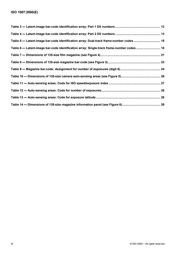 제목: ISO 1007:2000 - 사진 - 135 사이즈 필름과 매거진 - 사양 내용: 이 국제 표준은 다음을 명시합니다. 필름 길이의 치수, 잠재 이미지 프레임 번호, 필름 DX 번호를 식별하기 위한 잠재 이미지 디지털 바코드, 135 사이즈 카메라에 사용하기위한 낮 시간에로딩 필름 매거진의 치수, 필름의 DX 번호 및 노출 횟수를 식별하는 매거진 바코드, 적절한 설계 된 카메라에 사용되는 필름 속도, 노출 횟수 및 권장 노출 범위를 전기적으로 읽을 수있는 카메라 자동 감지 영역 등을 포함합니다. 또한, 필름 식별, 속도 및 노출 횟수가 카메라의 뒷면 창을 통해 확인 할 수있는 정보 패널을 필요로 합니다. 뿐만 아니라 필름 밀어 내기 힘 명세 및 필름스풀 부착 강도 명세도 포함되어있습니다. 이 국제 표준은 135 사이즈 매거진으로 리로딩 용도로 사용되는 "대량" 35 mm 필름 및 리로드 가능한 매거진에 적용하지 않습니다. 또한, 이 표준은 일회용 카메라에 사용되는 135 사이즈 필름과 매거진에 적용되지 않습니다.