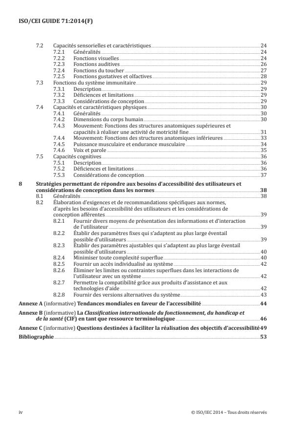 ISO/IEC Guide 71:2014 provides guidance to standards developers on addressing accessibility requirements and recommendations in standards that focus, whether directly or indirectly, on systems (i.e. products, services and built environments) used by people. To assist standards developers to define accessibility requirements and recommendations, it presents a summary of current terminology relating to accessibility, issues to consider in support of accessibility in the standards development process, a set of accessibility goals (used to identify user accessibility needs), descriptions of (and design considerations for) human abilities and characteristics, and strategies for addressing user accessibility needs and design considerations in standards.