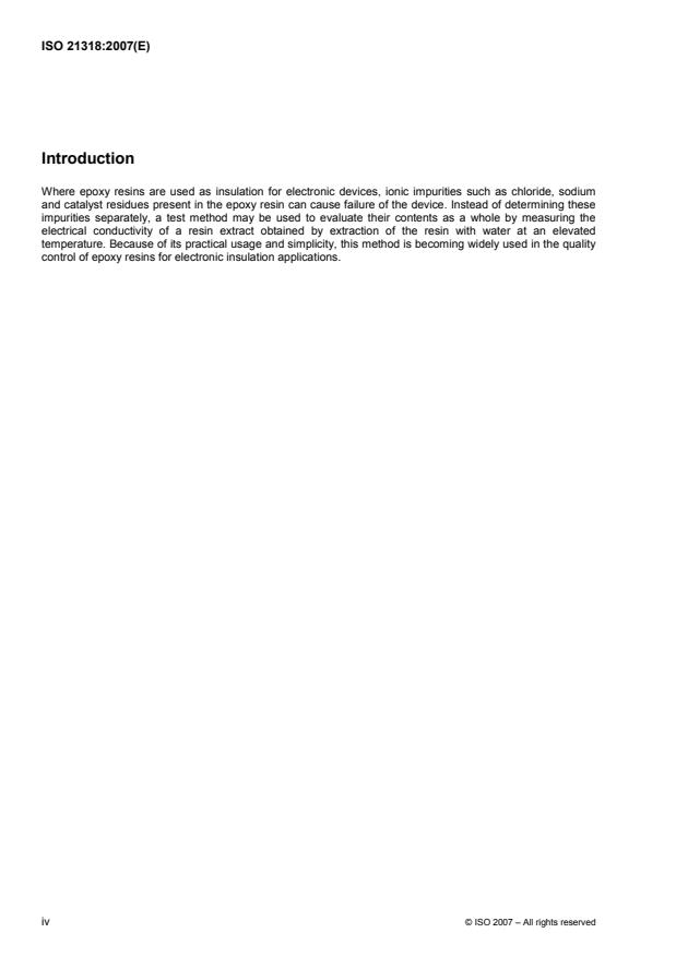 ISO 21318:2007 specifies a method for the determination of the electrical conductivity of an aqueous extract obtained by extraction of an epoxy resin with water at 95 °C. The method is applicable only to epoxy resins that are in the molten state at the extraction temperature (95 °C). The method is important for epoxy resins which are used as insulation materials for electronic devices. The electrical conductivity of the extract is used as a measure of the concentration of the ionic species in the resin.