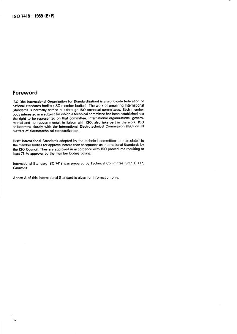 ISO 7418:1989 is a standard published by the International Organization for Standardization (ISO). Its full title is "Leisure accommodation vehicles — Vocabulary". This standard covers: Defines terms relating to vihicles as habitations, used for occasional occupation. Includes also definitions of some terms that affect vehicles as whole for some purposes of road use. The infomative annex A contains the bibliography. It gives the terms and definitions in English and French and finally these terms are repeated in alphabetical indexes.