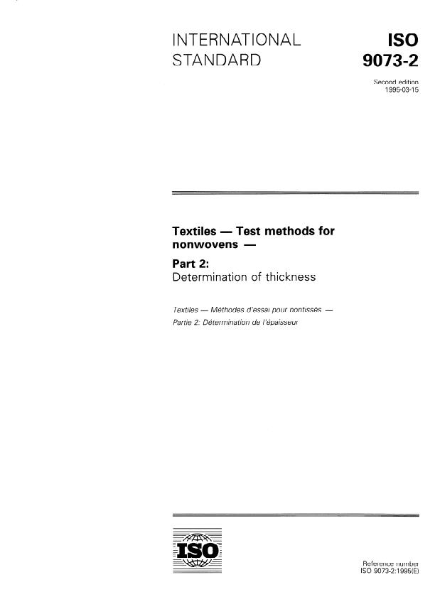ISO 9073-2:1995 is a standard published by the International Organization for Standardization (ISO). Its full title is "Textiles — Test methods for nonwovens — Part 2: Determination of thickness". This standard covers: Cancels and replaces the first edition (1989). Lays down methods for the determination of the thickness, when under a specific pressure, of normal and bulky nonwoven textiles.