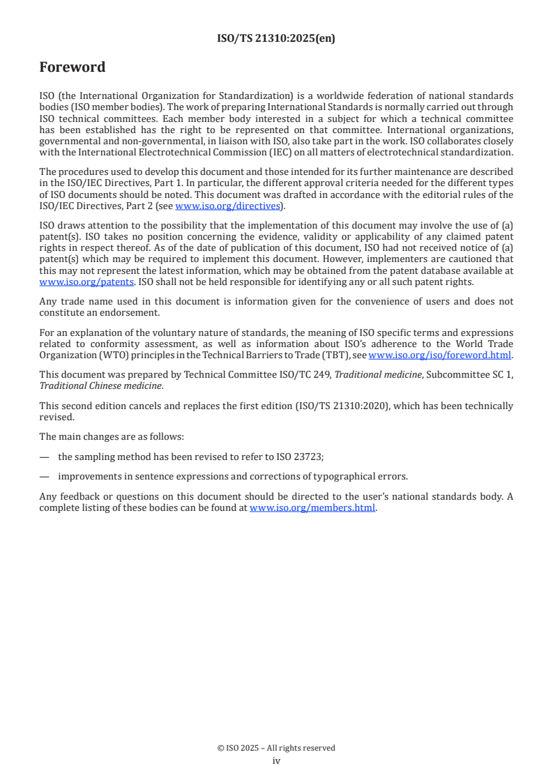 ISO/TS 21310:2025 is a technical specification published by the International Organization for Standardization (ISO). Its full title is "Traditional Chinese medicine - Microscopic examination of medicinal herbs". This standard covers: This document specifies the methods for microscopic examination of medicinal herbs. It covers the equipment, sampling, preparation and observation methods. This document is applicable to medicinal herbs used in traditional Chinese medicine, including Chinese materia medica (whole medicinal materials) and decoction pieces derived from plants. It is not applicable to medicinal materials derived from animals or minerals.