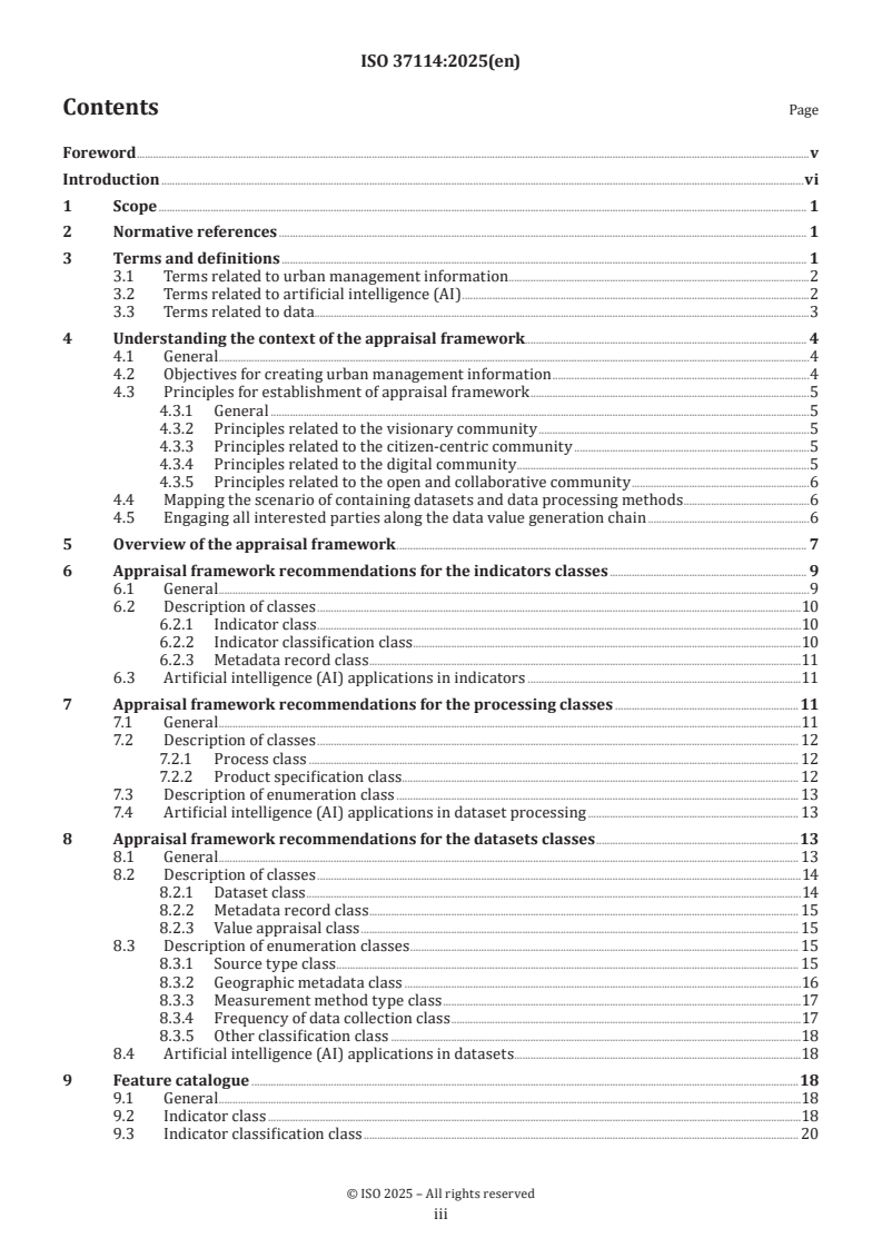 ISO 37114:2025 is a standard published by the International Organization for Standardization (ISO). Its full title is "Sustainable cities and communities - Appraisal framework for datasets and data processing methods that create urban management information". This standard covers: This document provides: - an appraisal framework for datasets and data processing methods that create and use urban management information derived from statistics, objectives, indicators and long-term goals for sustainable development of cities and communities; - numerous combinations of data sources and data processing methods, making it easier to create and maintain urban management information and get ready for value mining of big data within cities and communities; - approaches to appraise the necessary data to generate management information in an organization and how to classify them into different categories for regular review and update over time; - functional requirements to support the design, daily operation and management of information systems. This document is designed to be compatible with artificial intelligence (AI) systems. It helps cities and communities prepare for the application of AI in digital fields towards sustainable development. This includes the adoption of AI systems to process and analyse data collected from various sources. The goal is to identify and solve problems that cities and communities face to aid decision-making and achieve the six sustainability purposes as provided in ISO 37101, which align with the UN Sustainable Development Goals (SDGs) in the long term. This document is in line with the delivery principles of a smart city provided by ISO 37106, including visionary, citizen-centric, digital, open and collaborative. This document is useful for support data and dataset management for standards on indicators for sustainable cities and communities developed by ISO/TC 268, but does not provide guidance on how to use those standards. Additionally, this document can be of use in research and educational activities.