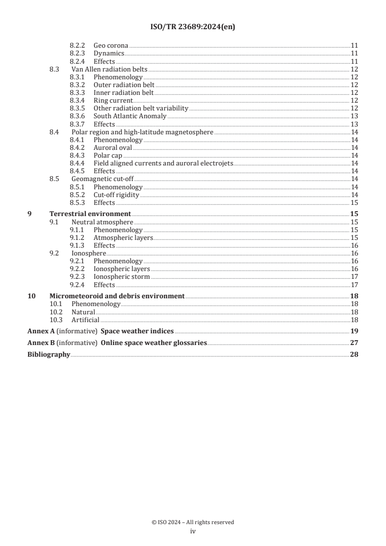 ISO/TR 23689 complements other ISO space environment documentation and operational space weather models. Annexes include space weather indices and links to online glossaries, providing practical reference material for implementation and integration into operational systems.