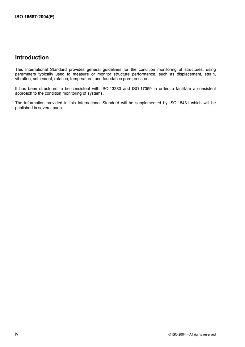 ISO 16587:2004은 구조물의 상태 모니터링을 위한 성능 매개변수를 설명하는 표준이다. 이 표준은 측정 유형, 허용 가능한 성능 한계, 데이터 획득 매개변수 및 측정 지침에 대한 다양한 측면을 다룬다. 이 표준은 건축, 인프라, 교통, 발전소, 석유 및 가스, 레저 및 엔터테인먼트와 같은 산업에 적용된다. 건물, 다리, 탑, 탱크, 지탱벽, 해상 플랫폼과 같은 정지 구조물에 대해서만 해당된다. 그러나 비정지 구조물과 이동 구조물은 해당되지 않는다.