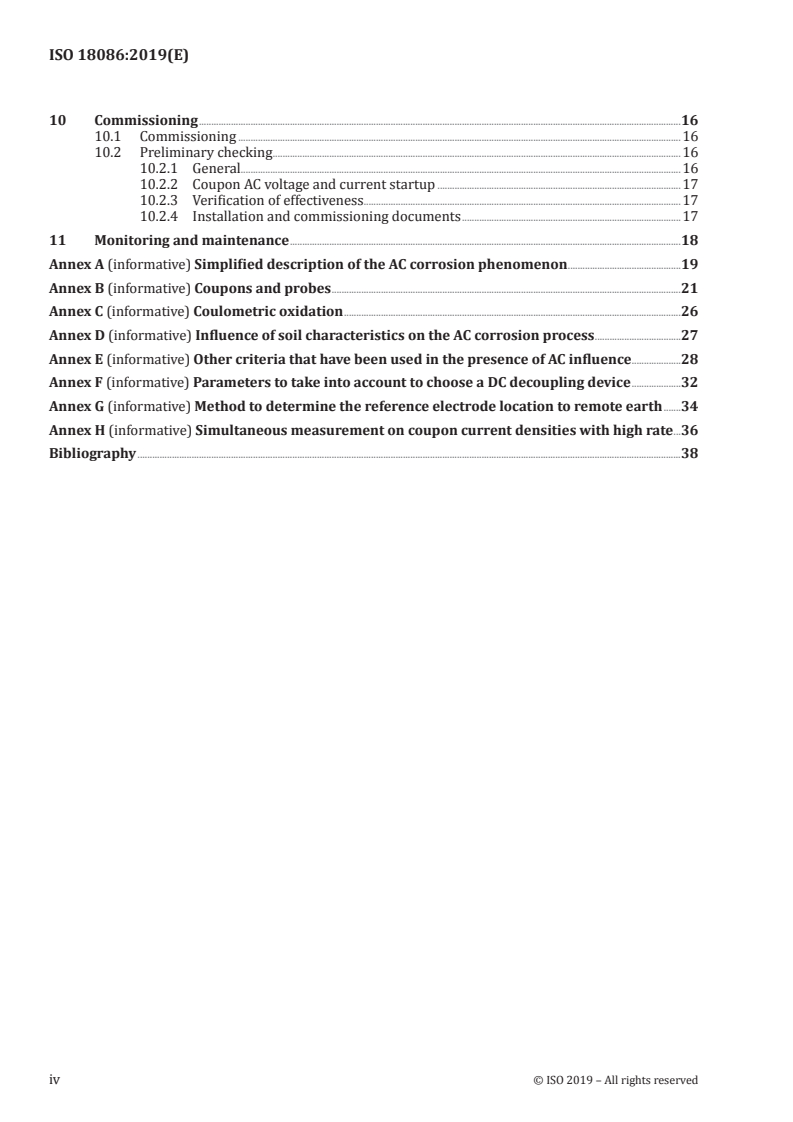 - Measurement techniques: procedures and equipment requirements for DC potential, AC voltage, coupon/probe installation, current density measurement, sampling rates and accuracy. Annexes cover detailed measurement methods (coupons, probes, coulometric oxidation).