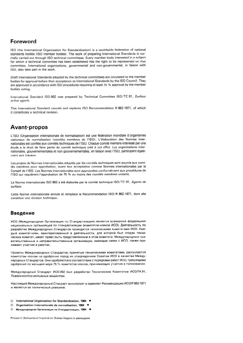 ISO 862:1984 is a standard published by the International Organization for Standardization (ISO). Its full title is "Surface active agents - Vocabulary". This standard covers: Defines terms frequently used in this field. Gives, in particular, specific terms for textiles applications, dry cleaning, etc., but terms for other applications may be introduced. Annex A contains scientific terms directly related to surface phenomena and to the preparation of surface active agents and Annex B general terms non-specific to the field of surface active agents.