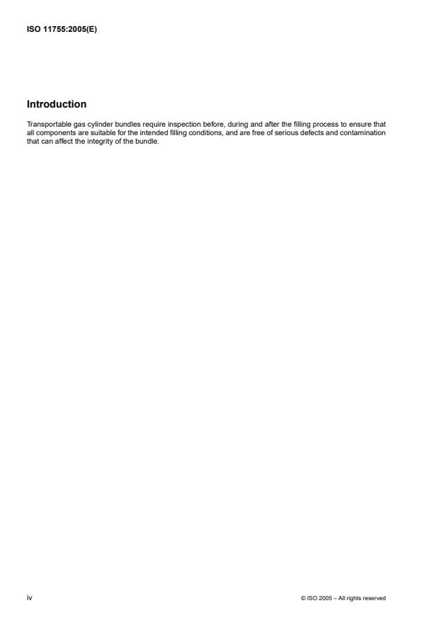 ISO 11755:2005 specifies the requirements for inspection before, during and after the time of filling for cylinder bundles for compressed and liquefied gases, also referred to as bundles. ISO 11755:2005 does not apply to acetylene bundles. ISO 11755:2005 does not apply to bundles when they are a part of a battery vehicle.