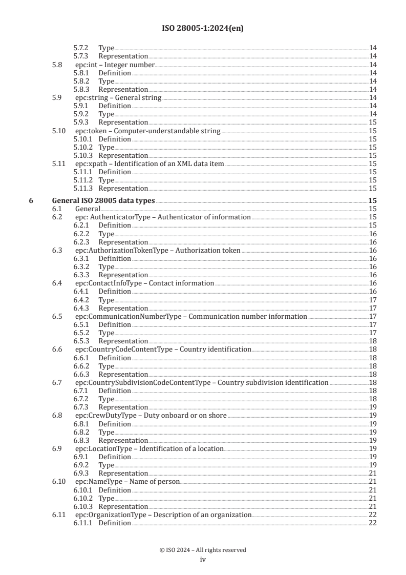 - Standardized data types: adapted epc:* types (e.g., epc:date, epc:dateTime, epc:string, epc:anyURI) and general ISO 28005 data types for common maritime data elements.