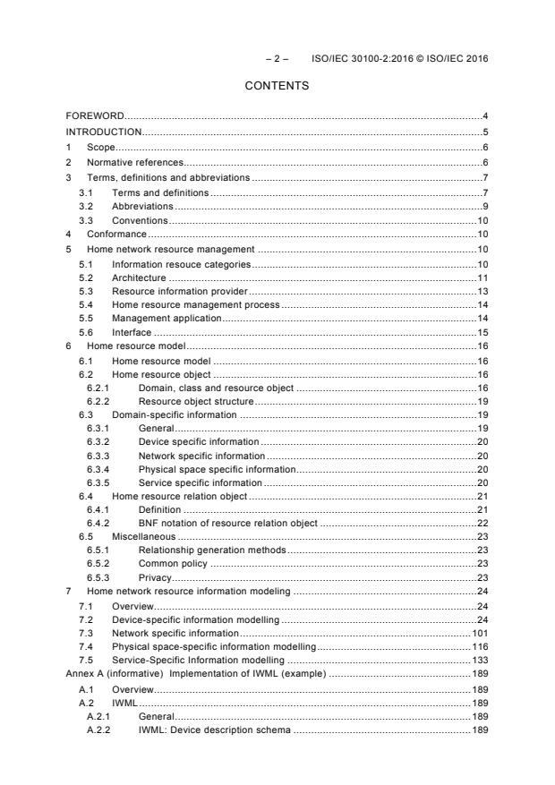 ISO/IEC 30100-2:2016(E) specifies the general information model and architecture for managing the resources in a home network. Home network resources are managed objects that provide home network services. Essential home resources include device, network and service resources.
