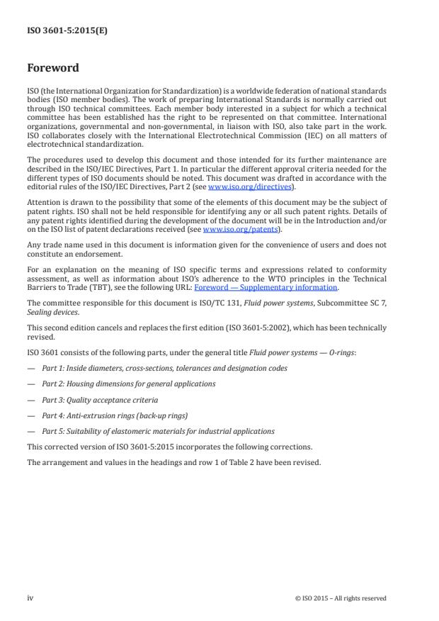 ISO 3601-5:2015 contains the material specification of a selection of standard elastomeric materials (rubber) for O-rings used in general industrial applications. It also indicates the ability of the materials to satisfy many of the requirements associated with fluid power components. Only materials which are in universal usage are specified; other compounds are available and can be used. The required physical properties and test methods (including test specimen) should be agreed upon between equipment manufacturer/user and O-ring manufacturer/supplier.