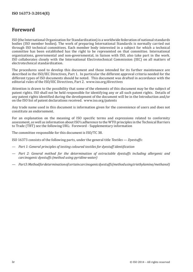 ISO 16373-3:2014 is a standard published by the International Organization for Standardization (ISO). Its full title is "Textiles - Dyestuffs - Part 3: Method for determination of certain carcinogenic dyestuffs (method using triethylamine/methanol)". This standard covers: ISO 16373-3:2014 specifies a method for the detection and quantitative determination of the presence of carcinogenic dyestuffs in dyed, printed or coated textile products by chromatographic analysis of their extracts.
