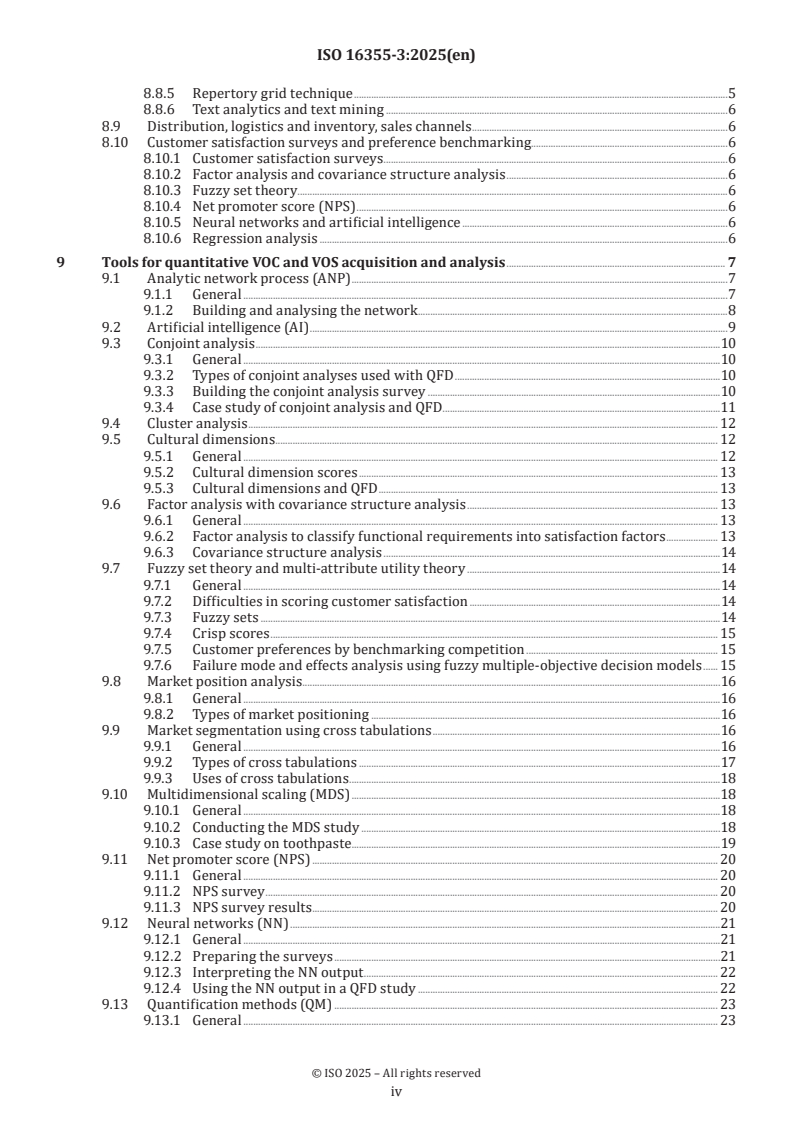 Keywords: ISO 16355-3:2025, voice of customer (VOC), voice of stakeholder (VOS), quantitative approaches, QFD, conjoint analysis, ANP, text analytics, customer needs, market segmentation.