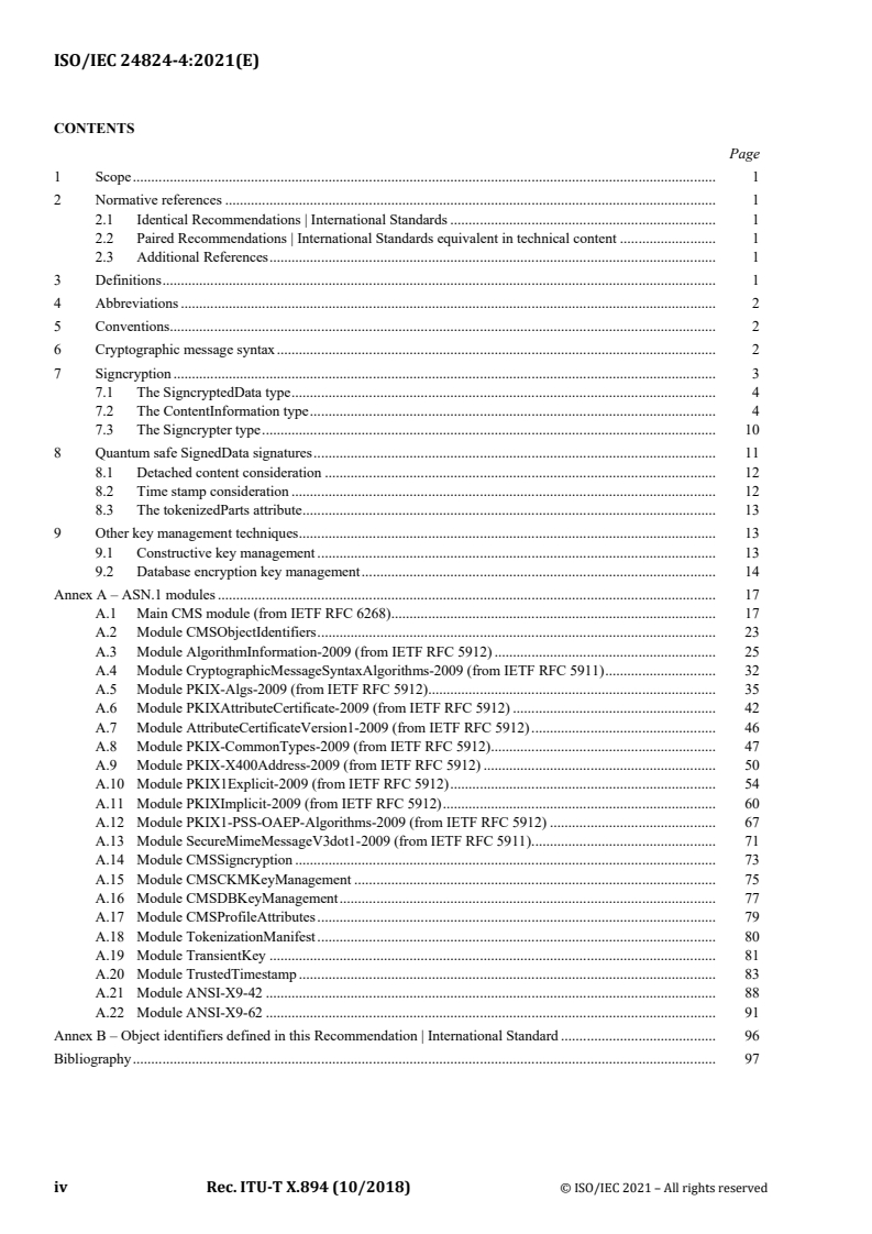 ISO/IEC 24824-4:2021 is a standard published by the International Organization for Standardization (ISO). Its full title is "Information technology - Generic applications of ASN.1 - Part 4: Cryptographic message syntax". This standard covers: This Recommendation | International Standard enhances the existing cryptographic message syntax (CMS) protocol by adding signcryption techniques and providing a new Abstract Syntax Notation One (ASN.1) module which conforms to the latest edition of the ASN.1 standard which can be used with all standardized encoding rules of ASN.1.
