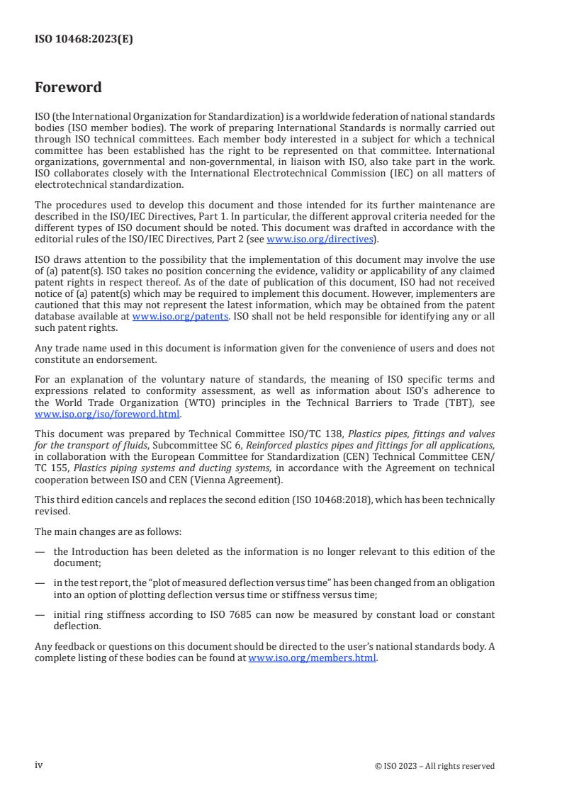 ISO 10468:2023 is a standard published by the International Organization for Standardization (ISO). Its full title is "Glass-reinforced thermosetting plastics (GRP) pipes - Determination of the ring creep properties under wet or dry conditions". This standard covers: This document specifies methods for determining the ring creep properties for glass-reinforced thermosetting plastics (GRP) pipes. Properties include the creep factor and the long-term creep stiffness. Testing is performed under either wet (total immersion in water) or dry conditions. Dry creep testing is typically performed for the assessment and control of raw material consistency. Wet creep testing is typically undertaken to determine the long-term creep performance in simulated use conditions.