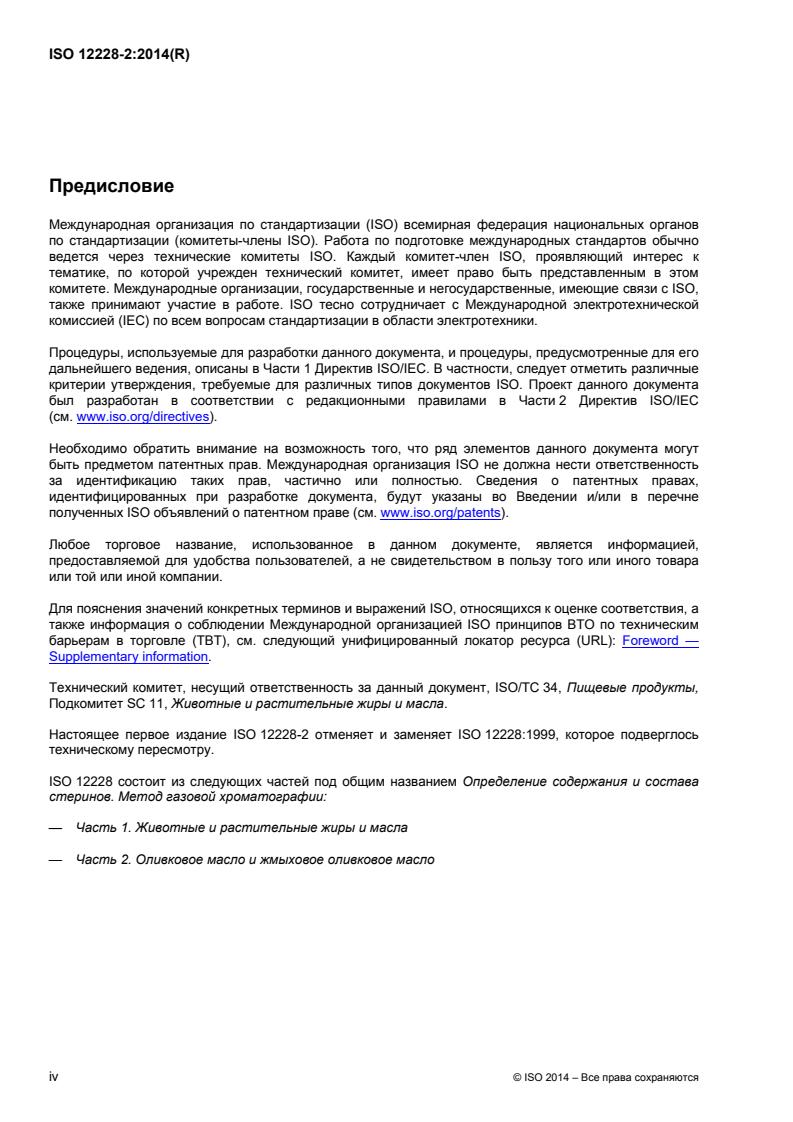 ISO 12228-2:2014 is a standard published by the International Organization for Standardization (ISO). Its full title is "Determination of individual and total sterols contents - Gas chromatographic method - Part 2: Olive oils and olive pomace oils". This standard covers: ISO 12228-2:2014 specifies a procedure for the gas chromatographic determination of the contents and composition of sterols and triterpene dialcohols in olive and olive pomace oils. For the determination of the contents and composition of sterols in all other animal and vegetable fats and oils, ISO 12228‑1 is to be used.