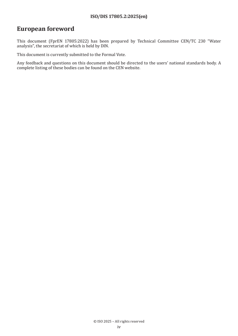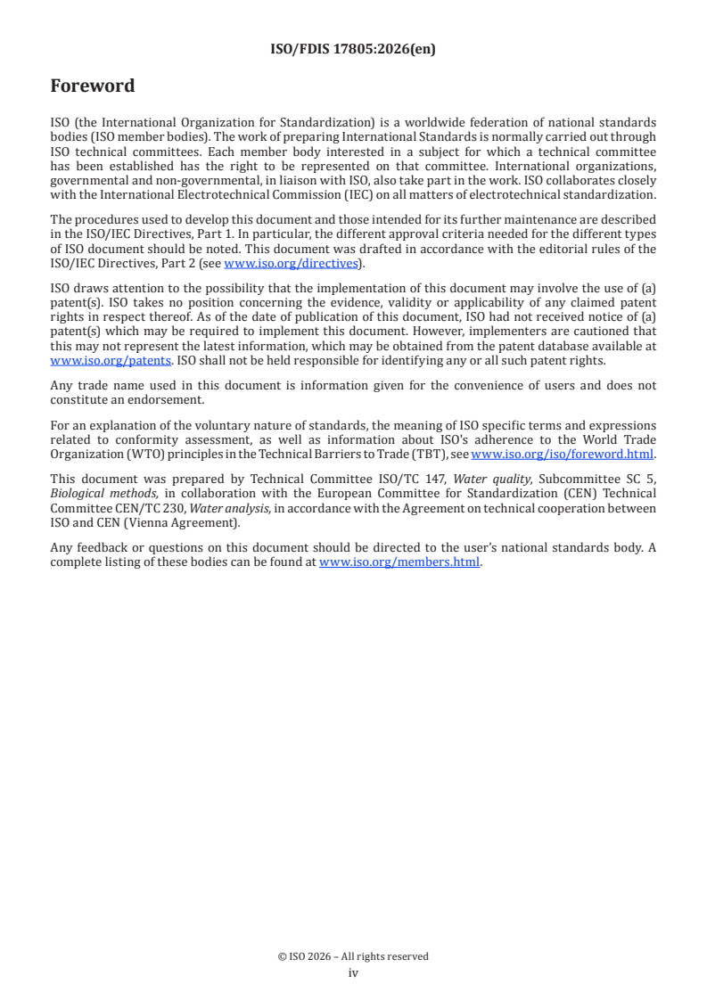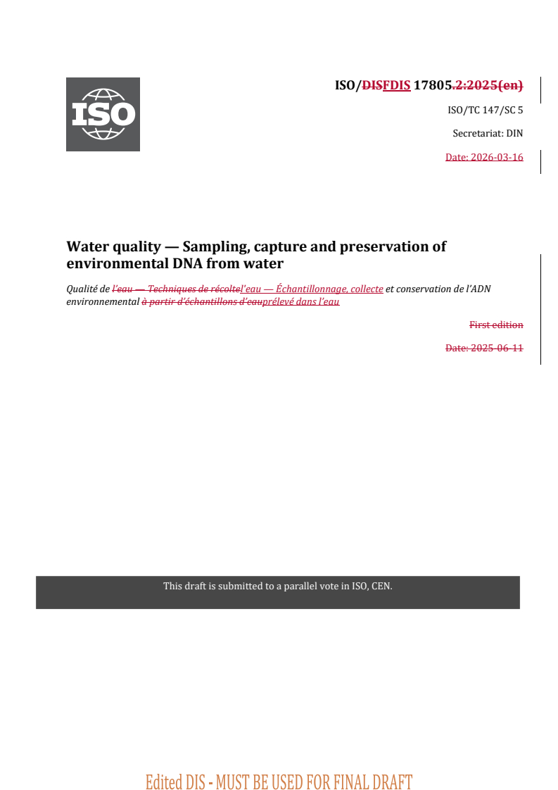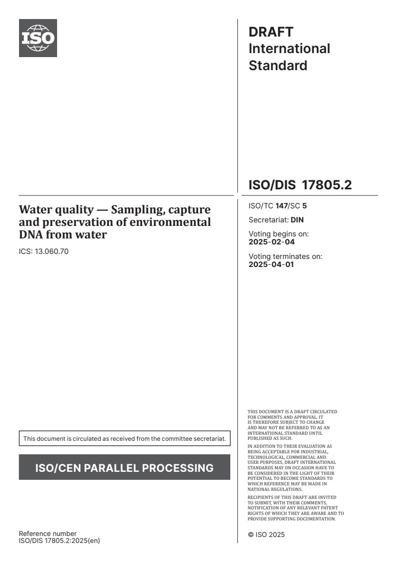 ISO/FDIS 17805 - Water quality — Sampling, capture and preservation of environmental DNA from water/21/2025