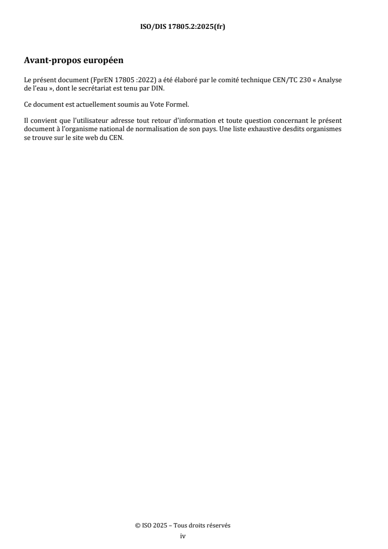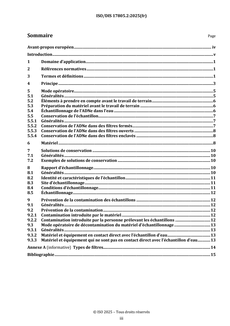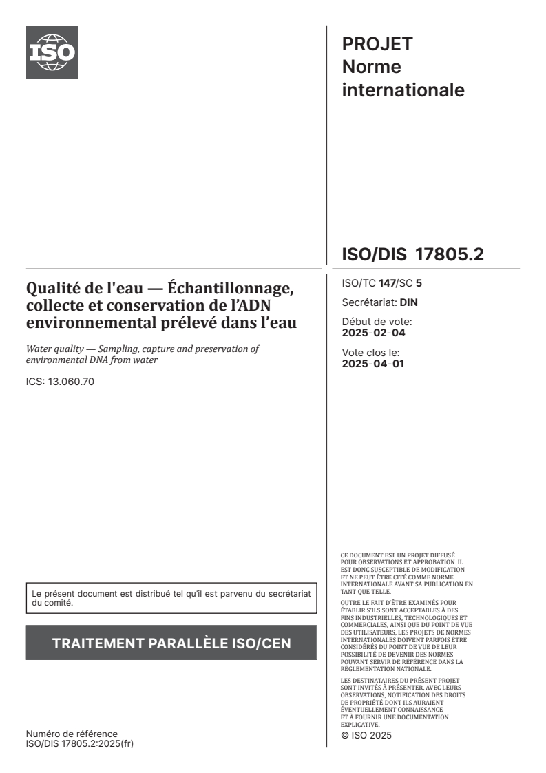 ISO/FDIS 17805 - Qualité de l'eau — Échantillonnage, collecte et conservation de l’ADN environnemental prélevé dans l’eau/11/2025