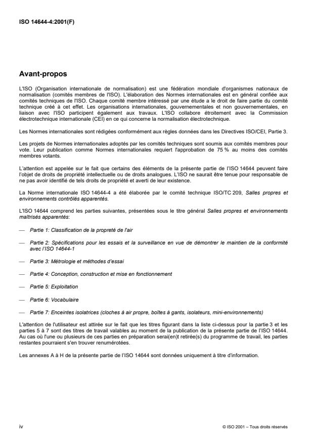 ISO 14644-4:2001 is a standard published by the International Organization for Standardization (ISO). Its full title is "Cleanrooms and associated controlled environments - Part 4: Design, construction and start-up". This standard covers: La présente partie de l'ISO 14644 spécifie les exigences pour la conception et la construction d'installations de salles propres, mais elle ne prescrit nullement les moyens spécifiques technologiques ni contractuels permettant de satisfaire à ces exigences. Elle s'adresse aux acheteurs, fournisseurs et concepteurs des installations de salles propres et comprend une liste indicative de paramètres importants de performance. Des conseils en matière de construction sont proposés, accompagnés des exigences de mise en fonctionnement et de qualification. Les éléments de base de la conception et de la construction, nécessaires pour assurer le maintien d'un fonctionnement satisfaisant, sont identifiés par l'examen des aspects pertinents de l'exploitation et de la maintenance. NOTE Des conseils complémentaires concernant les exigences ci-dessus sont fournis dans les annexes A à H. D'autres parties de l'ISO 14644 sont susceptibles de fournir des renseignements complémentaires. L'application de la présente partie de l'ISO 14644 est sujette aux limitations suivantes : - les exigences de l'utilisateur sont représentées par l'acheteur ou le prescripteur ; - des procédés spécifiques qu'hébergera l'installation de salle propre ne sont pas spécifiés ; - les règlements de sécurité et de protection incendie ne font pas l'objet d'un examen particulier; il convient de se conformer aux règlements nationaux ou locaux applicables; - on ne tient compte des fluides pour le procédé et des servitudes de raccordement et alimentations des systèmes que pour ce qui concerne le cheminement des réseaux entre, et à l'intérieur, des différentes zones de propreté ; - en ce qui concerne la mise en service et la maintenance, il n'est tenu compte que des exigences spécifiques aux salles propres.
