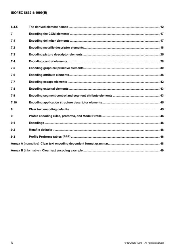 ISO/IEC 8632-4:1999 specifies the Clear Text Encoding for the Computer Graphics Metafile (CGM) - a standardized metafile format for the storage and transfer of picture description information. This part of ISO/IEC 8632 defines how each CGM element (as described in ISO/IEC 8632-1) is represented in a human-readable text form so metafiles can be created, inspected, and edited with ordinary text editors. The encoding includes allowed abbreviations, the overall metafile format, comment conventions, and rules to make files both easy to type and machine-parseable.