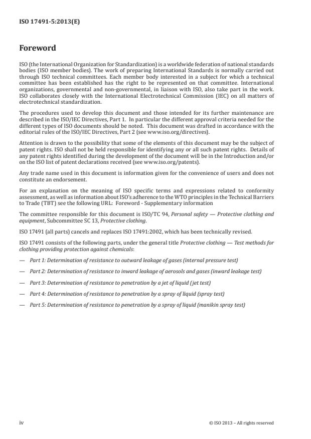 ISO 17491-5:2013 specifies an alternative test method to the one described in ISO 17491-4. The method for determining the resistance to chemical spray penetration differs from the method in ISO 17491-4 in that it uses a static manikin instead of a test subject. It also uses a different spray configuration and duration.